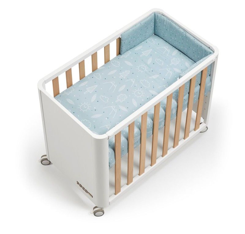 La nueva minicuna Doco Style cuenta con un diseño innovador. Cabezales tapados lacados en color blanco, laterales con láminas de madera de haya y la marca DOCO esculpida en madera que le proporciona una personalidad propia, actual y cualitativa.