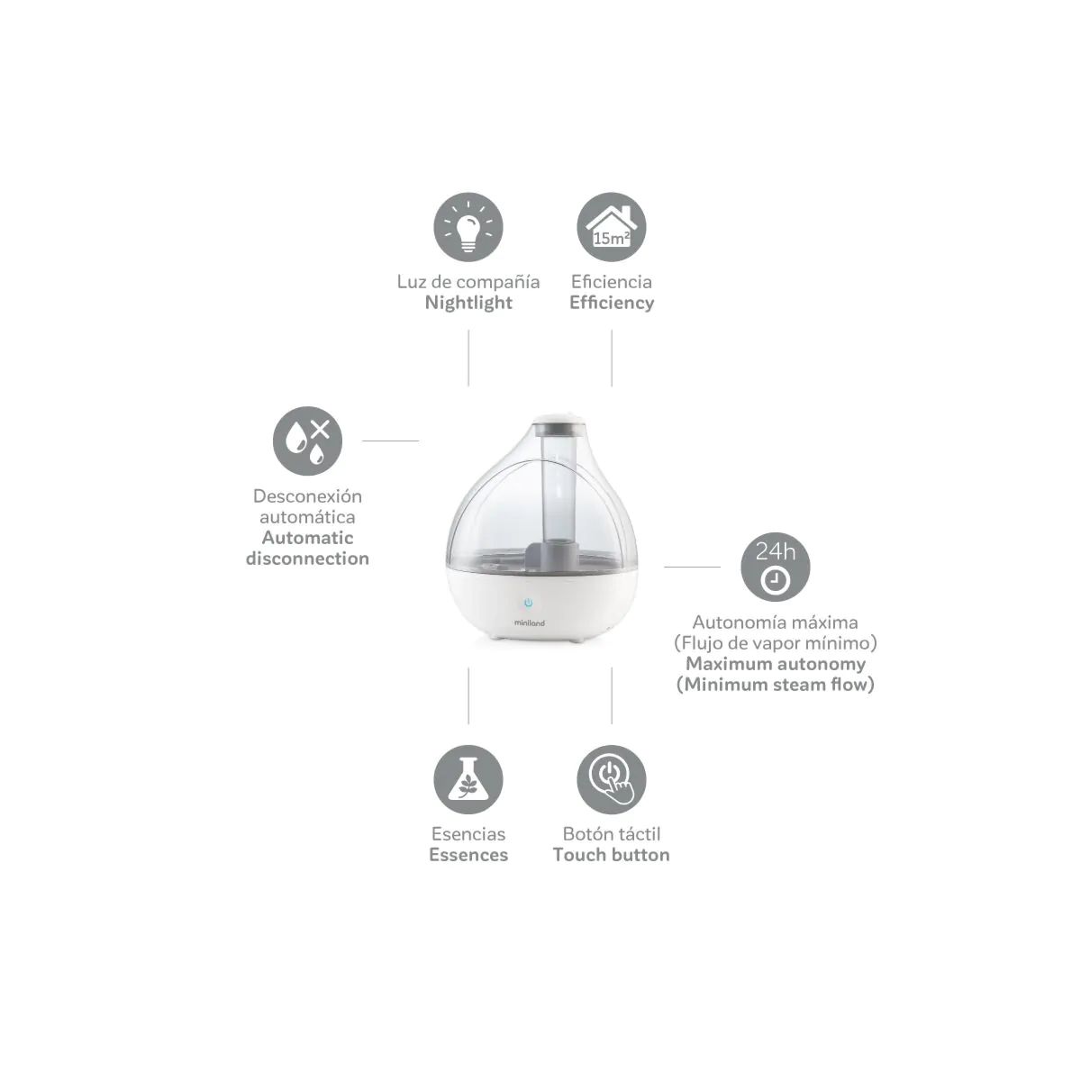 Elegancia y funcionalidad con el mínimo tamañohumidrop es el humidificador de menor tamaño de Miniland Baby y estádotado de un diseño muy elegante.