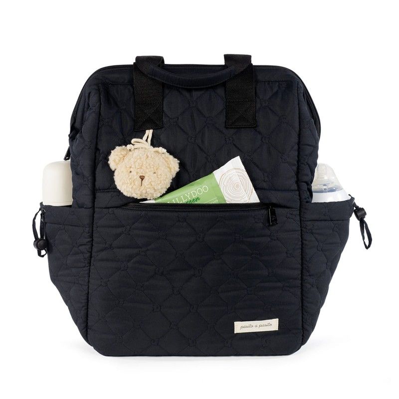 También incorpora dos bolsillos laterales para botellas o biberones. Tiene 2 asas grandes ajustables para que puedas usarla colgada a la espalda, asas de mano y otras dos asas pequeñas para que puedas usarla colgada del carrito del bebé. Incluye cambiador. Está fabricado con materiales de gran calidad, libres de colorantes azoicos, ftalatos y sustancias nocivas para la salud.