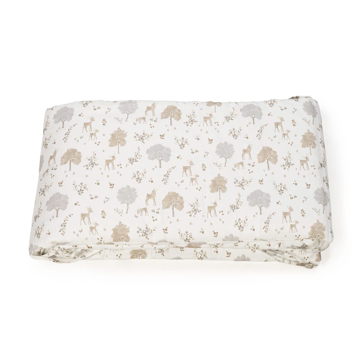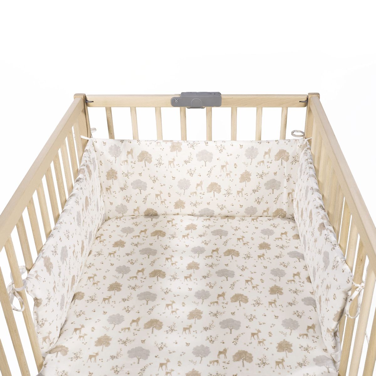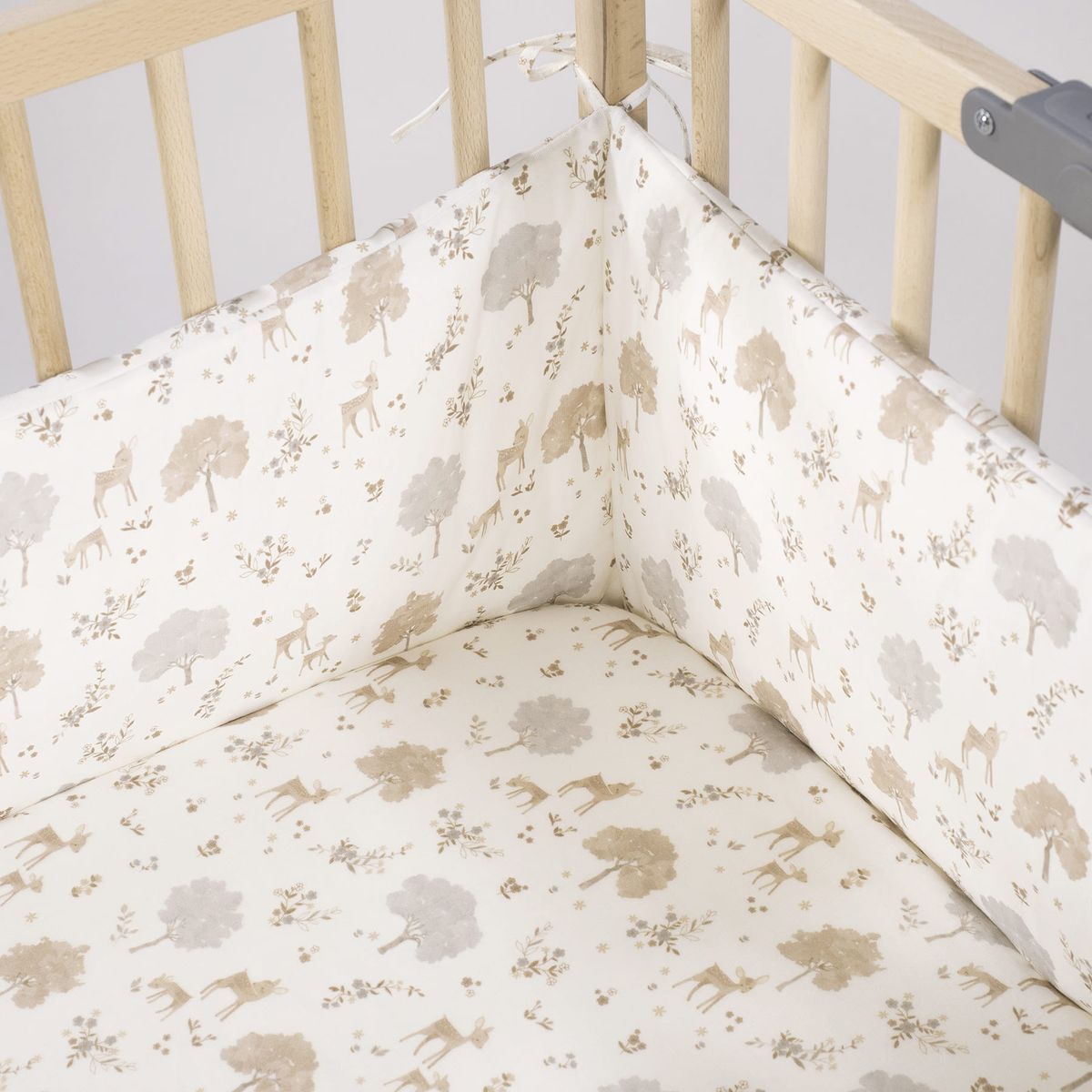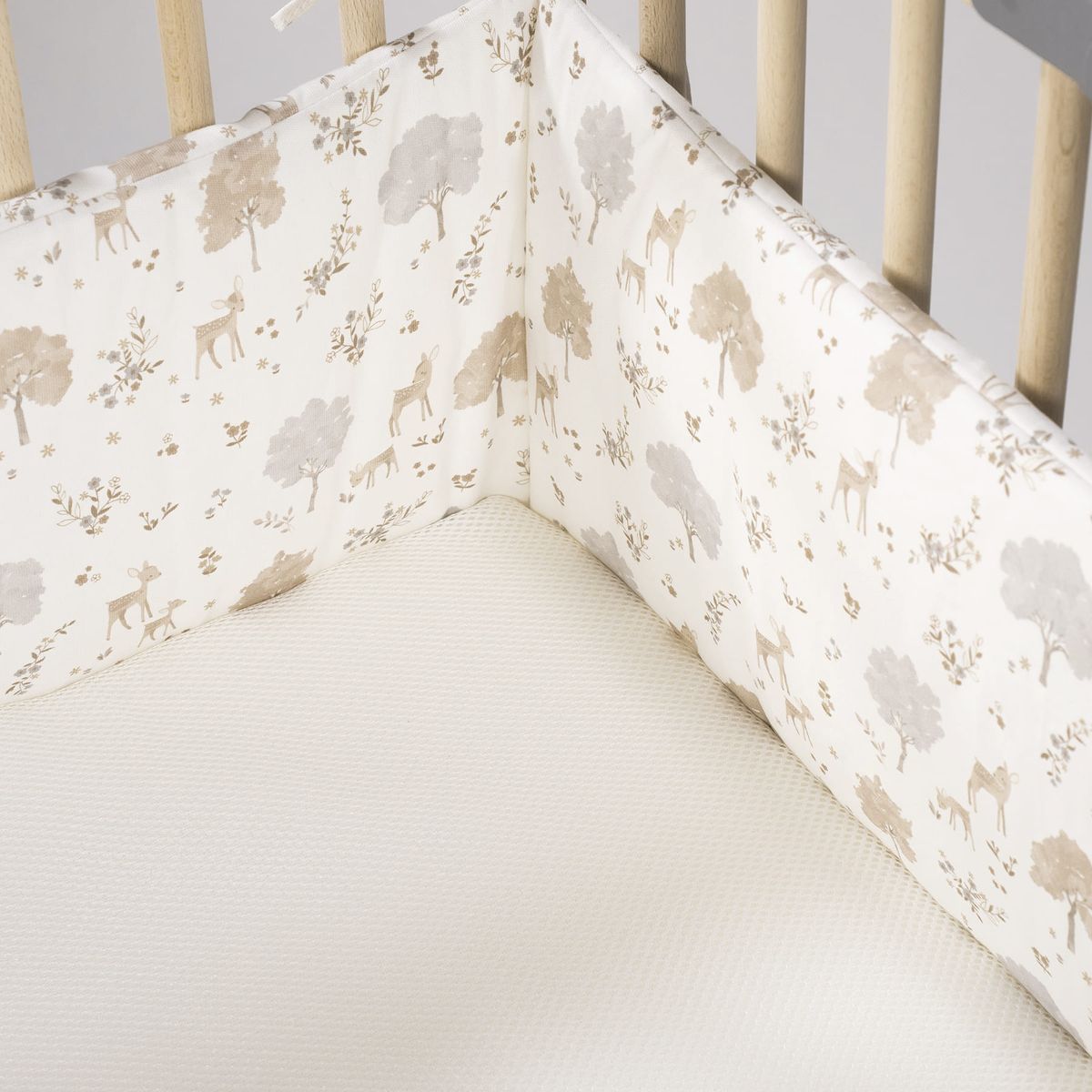Diseño «Nara» inspirado en la naturaleza: el protector presenta un hermoso y sutil estampado de ciervos y árboles en tonos neutros y suaves (beige, gris claro, blanco), que evocan la serenidad del bosque.