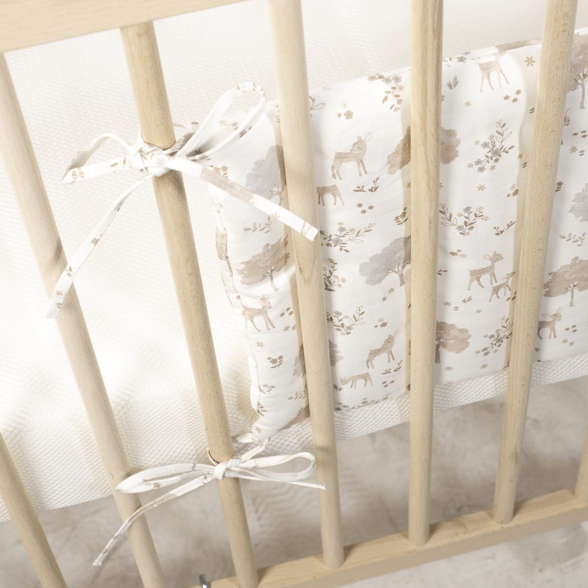 Ajuste perfecto para cunas estándar: especialmente diseñado para cunas de 120×60 cm, se fija fácilmente a los barrotes mediante lazadas, asegurando una sujeción firme y estable. Cumple con la Normativa de Seguridad EN-16780: la tranquilidad es primordial. Este protector de cuna cumple con la rigurosa normativa europea EN-16780 Requisitos de seguridad y métodos de ensayo para los protectores de cuna infantiles, lo que certifica su seguridad y adecuación para el uso en cunas de bebé. El protector de Cuna Nara no solo es un elemento de seguridad indispensable, sino también un hermoso detalle decorativo que aporta calidez y armonía a la habitación de tu bebé.
